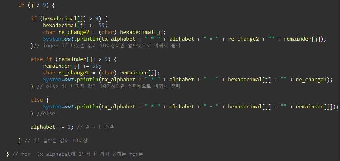 10 이상의 값을 곱할 때 A ~ F까지 출력