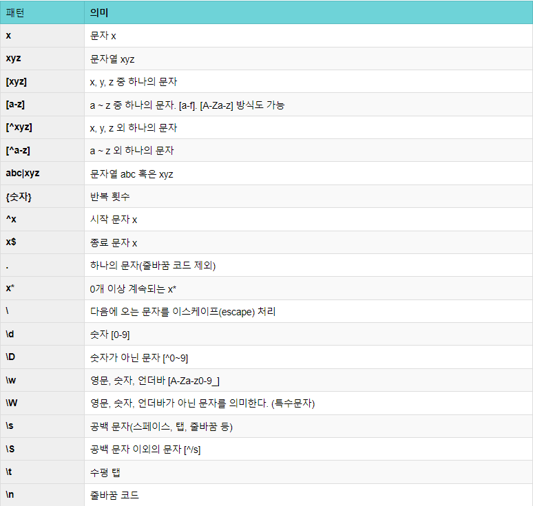 | \s | 공백 문자(스페이스, 탭, 줄바꿈 등) |