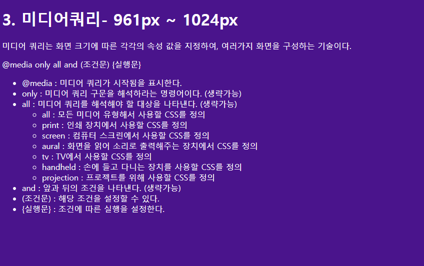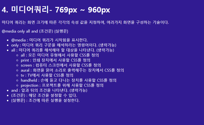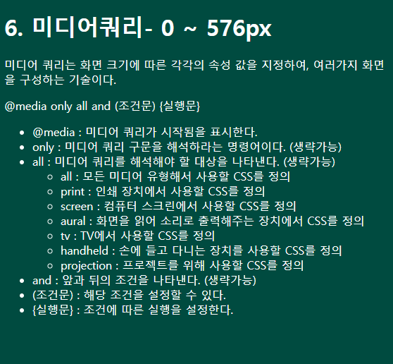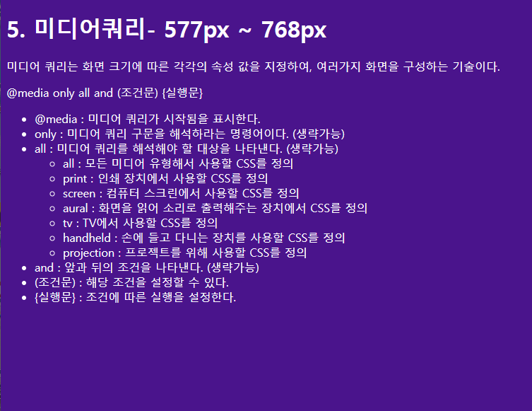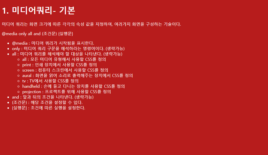 <p>미디어 쿼리는 화면 크기에 따른 각각의 속성 값을 지정하여, 여러가지 화면을 구성하는 기술이다.</p>