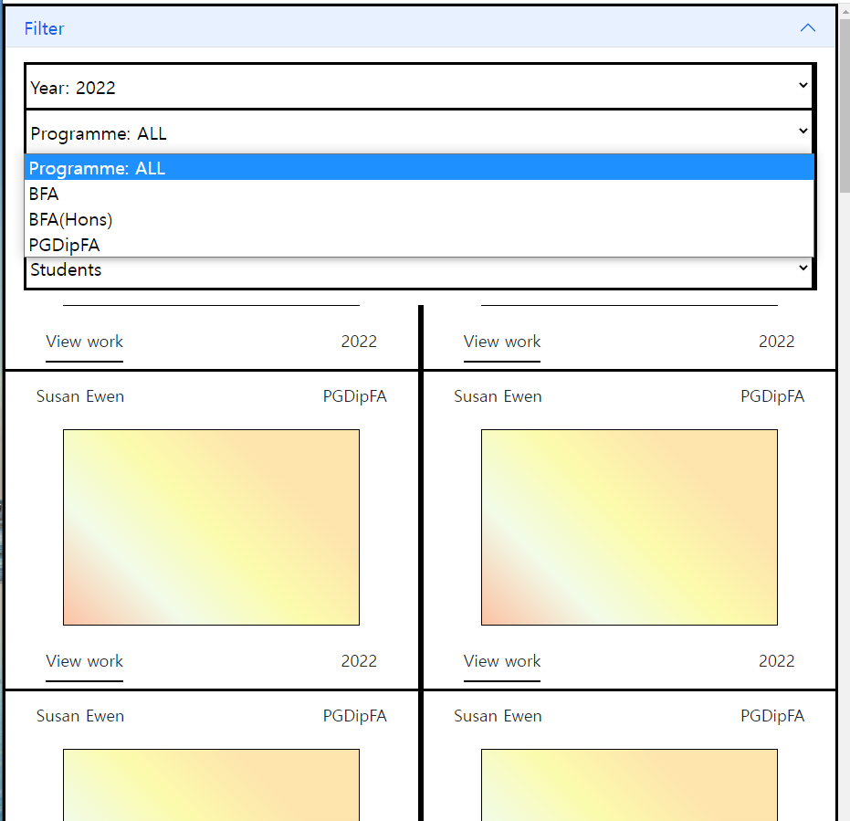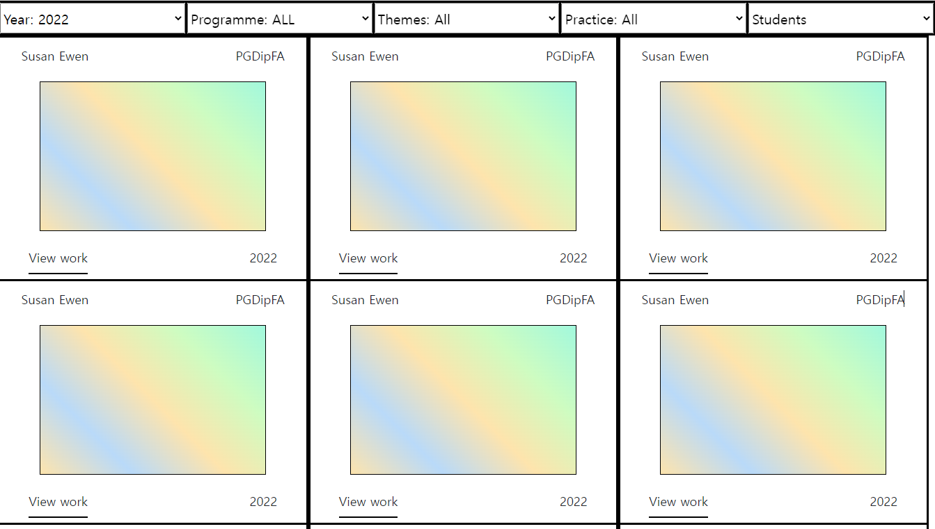 Year: 2022 2021 2020 2019 Programme: ALL BFA BFA(Hons) PGDipFA Themes: All Abstraction Affect Agency Practice: All Artist's Book Ceramics Comics Students Susu Ali senescall Alyssa Keen