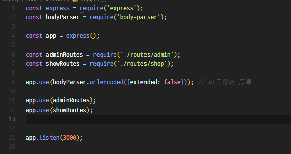 admin.js를 app.js에 임포트 하기 위해 adminRoutes라는 이름으로 reutes의 상대 겅로를 잡아주고 그 안의 admin 파일을 지정해 준다.