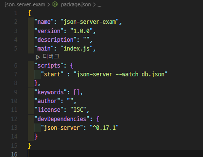 위와 같이 매번 명령어를 입력하는 것은 번거로우니 package.json 파일의 scripts를 다음과 같이 수정하여 JSON Server를 실행해 보자.