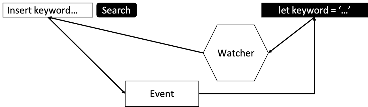 단방향 데이터 바인딩은 단 하나의 Watcher가 자바스크립트의 데이터 갱신을 감지하여 사용자의 UI 데이터를 갱신합니다. 사용자가 UI를 통해 자바스크립트의 데이터를 갱신할 때는, 이벤트를 통해 갱신하게 됩니다. 이처럼 단방향 데이터 바인딩은 하나의 Watcher를 사용하기 때문에 양방향 데이터 바인딩이 가지는 성능적인 이슈를 해결하고 더 확실하게 데이터를 추적할 수 있게 해 줍니다.