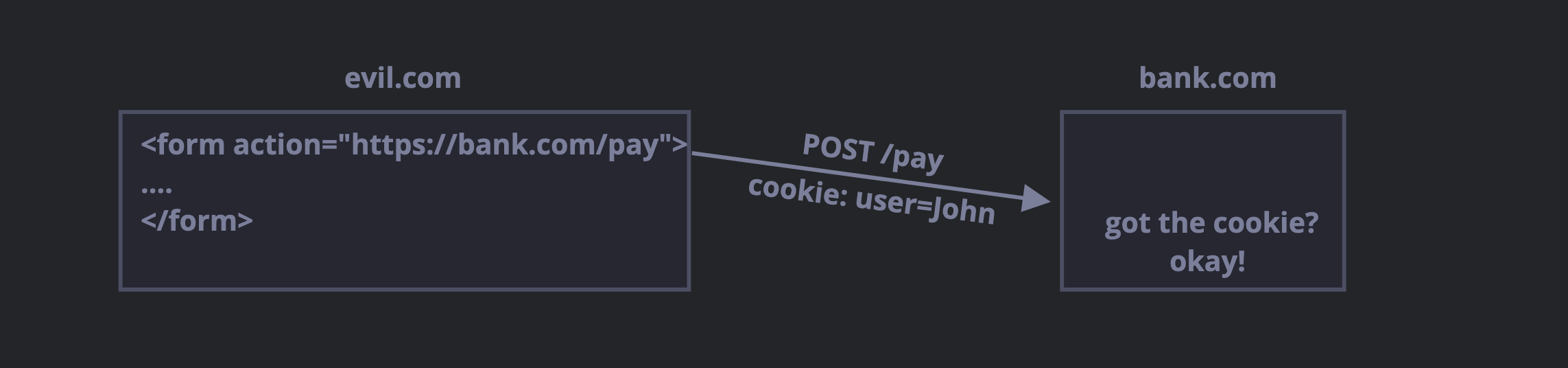 폼이 evil.com에서 은행 사이트로 바로 전송될 때 인증 쿠키도 함께 전송됩니다. bank.com에 요청을 보낼 때마다 bank.com에서 설정한 쿠키가 전송되기 때문입니다. 은행은 전송받은 쿠키를 읽어 (해커가 아닌) 계정 주인이 접속한 것이라 생각하고 해커에게 돈을 송금합니다.