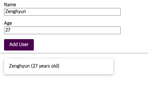 다음 form은 이름과 나이를 입력하고 'Add User' 버튼을 누르면 아래와 같이 Zenghyun (27 years old)라는 결과를 알려줍니다.