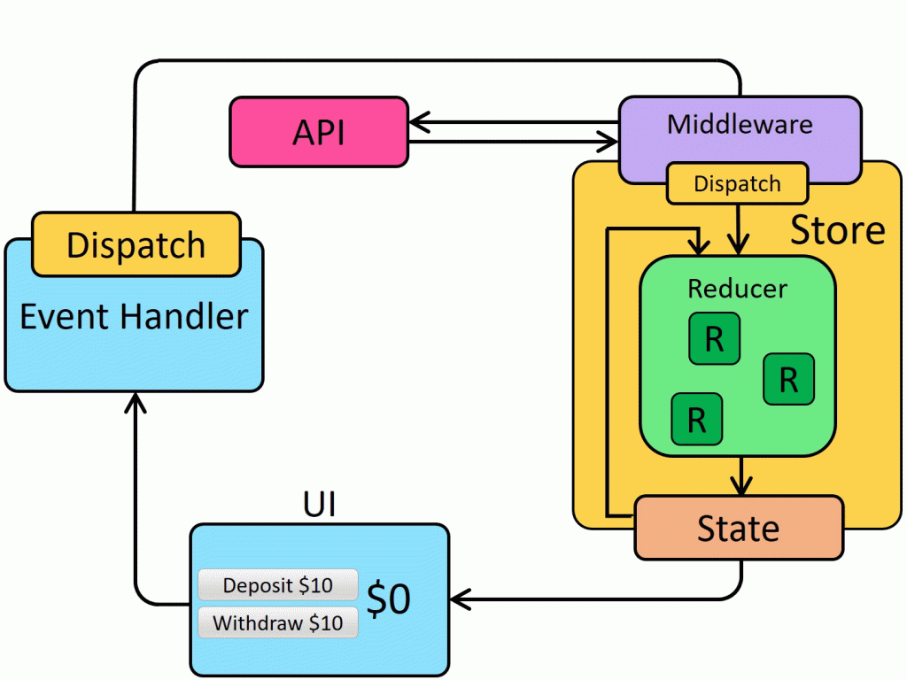 Action 객체가 dispatch() 메서드에 전달 -> dispatch()를 통해 Reducer를 호출 ->Reducer는 새로운 Store를 생성