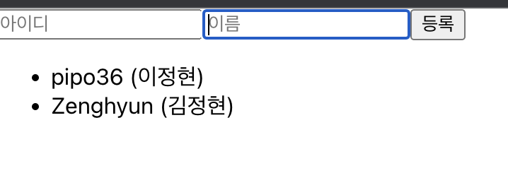 폼에서 아이디와 이름을 입력하면 하단 리스트에 추가되고, 리스트 항목을 클릭하면 삭제되는 컴포넌트입니다.