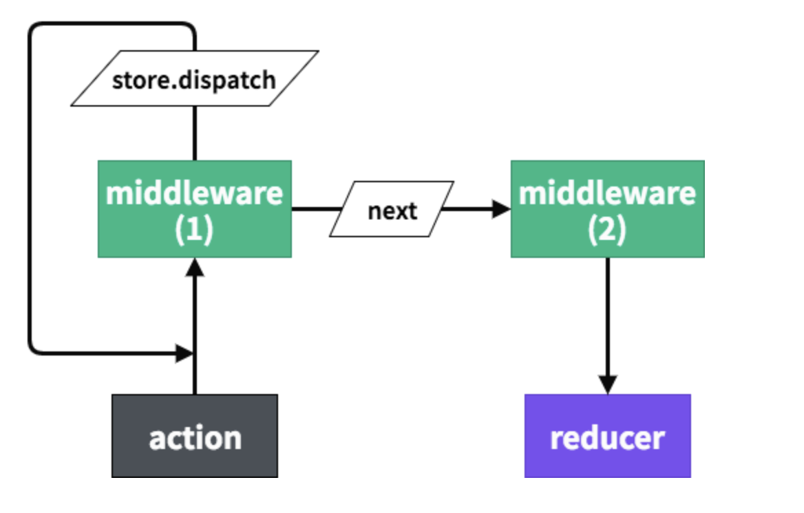 미들웨어 내부에서 store.dispatch를 사용하면 첫 번째 미들웨어부터 다시 처리합니다. 만약 미들웨어에서 next를 사용하지 않는다면 액션이 리듀서에 전달되지 않습니다. 즉, 액션이 무시되는 것 입니다.