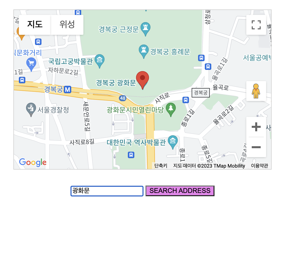 1 2 3 4 5 6 7 8 9 10 11 12 13 14 15 16 17 18 19 20 21 22 23 24 25 26 27 28 29 30 31 32 33 34 35 36 37 38 39 40 41 42 43 44 | import axios from "axios"; const form = document.querySelector("form")!; const address = document.getElementById("address")! as HTMLInputElement; const GOOGLE_API_KEY = "발급받은 API KEY"; declare var google: any; type GoogleGeocodingResponse = { results: { geometry: { location: { lat: number; lug: number } } }[]; status: "OK" | "ZERO_RESULTS"; }; const submitHandler = (event: Event) => { event.preventDefault(); const inputAddressValue = address.value; axios .get<GoogleGeocodingResponse>( `https://maps.googleapis.com/maps/api/geocode/json?address=${encodeURI( inputAddressValue )}&key=${GOOGLE_API_KEY}` ) .then((response) => { if (response.data.status !== "OK") { throw new Error("Could not find address"); } const coordinates = response.data.results[0].geometry.location; const map = new google.maps.Map(document.getElementById("map"), { center: coordinates, zoom: 16 }); new google.maps.Marker({position: coordinates, map: map}); }) .catch((e) => { alert(e.message); console.log(e); }); }; form.addEventListener("submit", submitHandler); | cs |