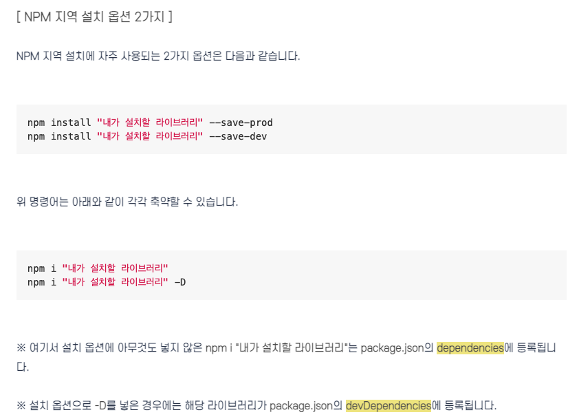 dependencies의 경우 애플리케이션과 직관되어 있는, 화면에 영향을 미치는 라이브러리 같은 것을 설치하고, devDependencies의 경우 webpack, js-compress, sass 등 개발을 할 때 도움을 주는 개발용 라이브러리를 설치합니다.