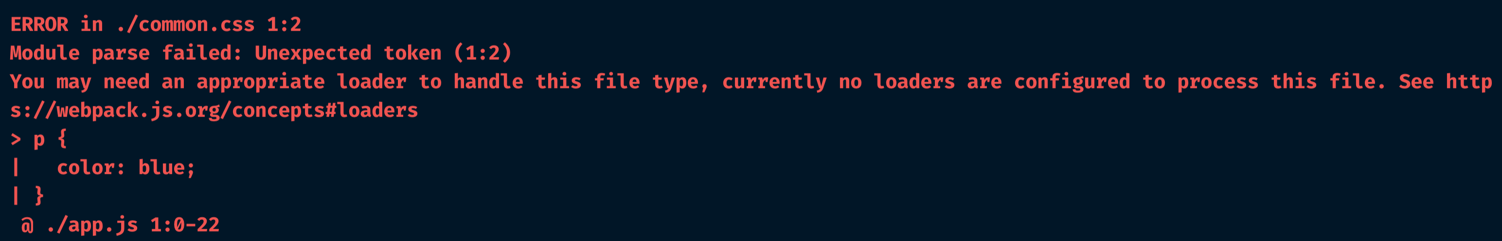 위 에러 메시지의 의미는 app.js 파일에서 임포트한 common.css 파일을 해석하기 위해 적절한 로더를 추가해 달라는 것입니다.