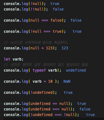 - 이처럼 undefined는 개발자가 의도적으로 할당하기 위한 값이 아니라 자바스크립트 엔진이 변수를 초기화할 때 사용하는 값이다.