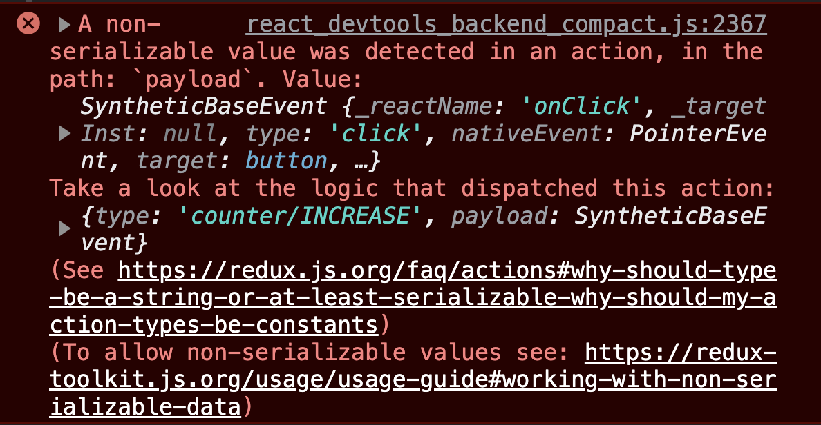 Redux는 state, action에 직렬화가 불가능한 값을 전달할 수 없기 때문에 에러가 발생한 것입니다.