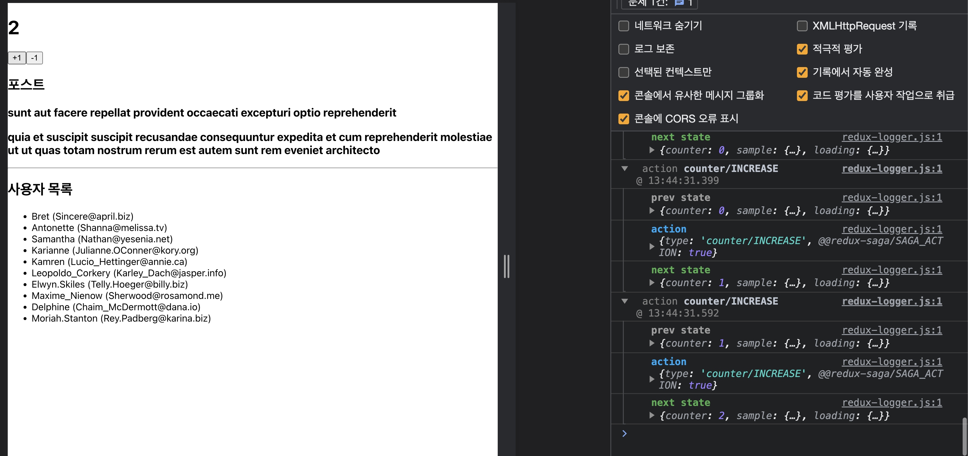 +1 버튼을 두 번 누르면 INCREASE_ASYNC 액션이 두 번 디스패치되고, 이에 따라 INCREASE 액션도 두 번 디스패치됩니다. takeEvery를 사용하여 increaseSaga를 등록했으므로 디스패치 되는 INCREASE_ASYNC 액션에 대해 1초 후 INCREASE 액션을 발생시켜 줍니다.