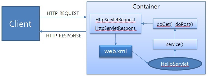 ④ 컨테이너는 서블릿 service() 메서드를 호출하며, POST, GET여부에 따라 doGet() 또는 doPost()가 호출된다.