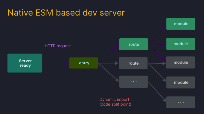 이와 같은 문제점을 Vite는 Native ESM이라는 브라우저의 자체적인 모듈 기능을 사용하여 해결했습니다. Vite가 실행하는 개발 서버는 브라우저가 요청하는 모듈을 전송해 주고, 모듈 번들링 기능을 브라우저가 수행하기 때문에 개발 서버의 구동이 아주 빠릅니다.