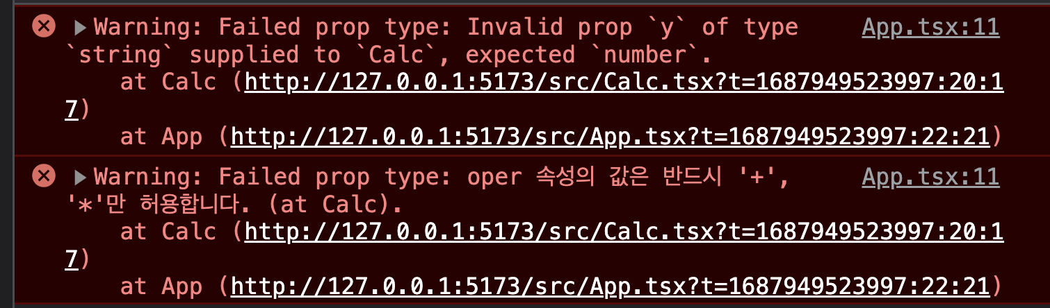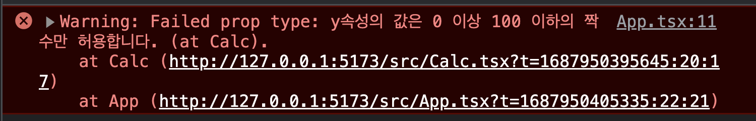 여기서 의도적으로 잘못된 속성 값을 전달하도록 App 컴포넌트의 코드를 변경해 보겠습니다.