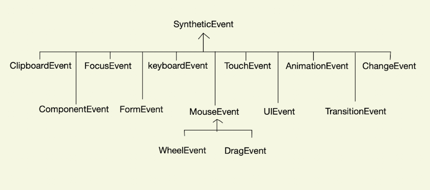 리액트 이벤트 핸들러 함수에서의 이벤트 아규먼트는 브라우저의 종류와 관계없이 이벤트를 처리할 수 있도록 SyntheticEvent <T> 타입으로 추상화합니다. SyntheticEvent를 기반으로 확장된 다양한 Event 타입은 다음과 같습니다.