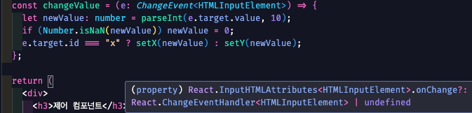 위 그림처럼 툴팁에 'React.ChangeEventHandler<HTMLInputElement>' 라는 타입이 보이면 Event Argument의 타입을 React.ChangeEvent <HTMLInputElement>로 설정하면 됩니다.