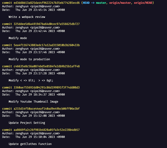 터미널에 git log를 입력하면 그간 내가 작업한 파일의 commit log를 확인할 수 있습니다.