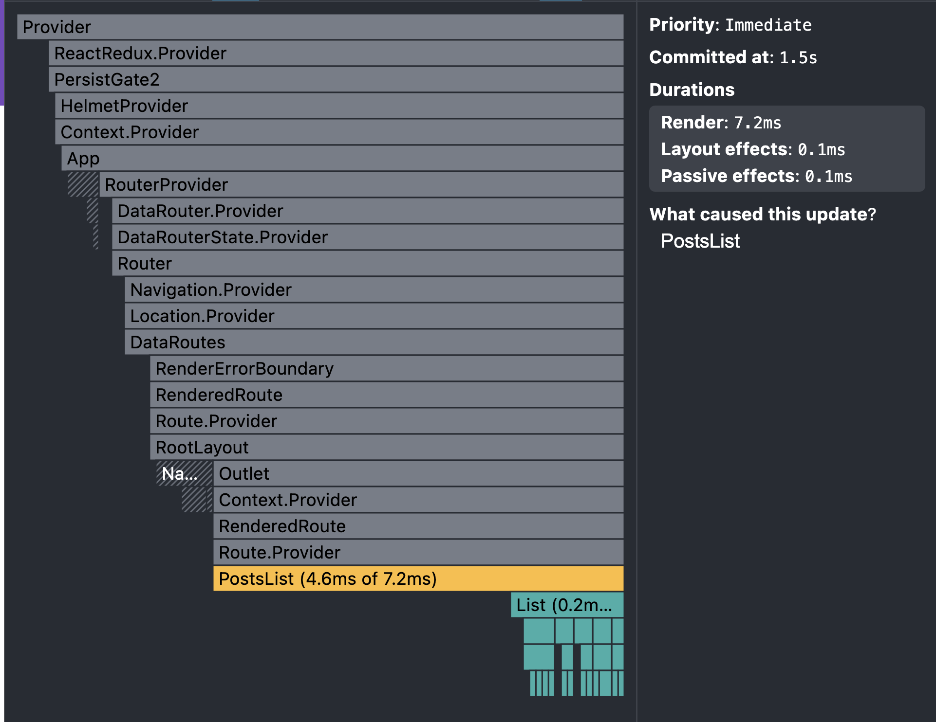 측정 방식: Redux Profiler를 이용하여 렌더링 되어있는 post의 reaction 버튼을 눌렀을 때, 다시 렌더링되는 시점을 측정