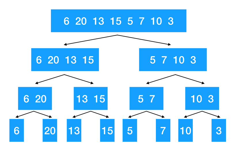- 배열이 비어 있거나 하나의 요소를 가질 때까지 배열을 반으로 나눕니다.
