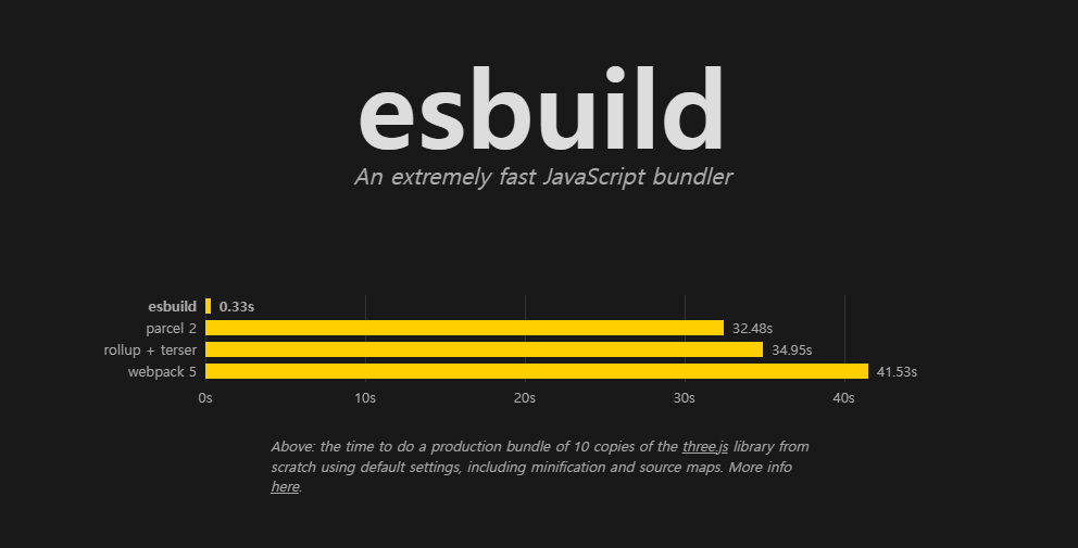 ESBuild는 내부적으로 GO로 작성되었고 JS 기반의 번들러보다 10배에서 100배까지 빠른 엄청난 퍼포먼스를 보여줬습니다.