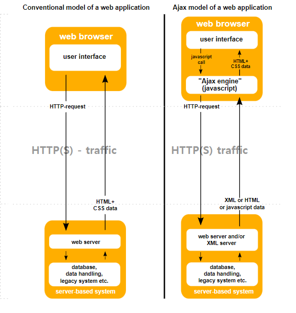그러나 Ajax는 html 페이지 전체가 아닌 일부분만 갱신할 수 있도록 XML HttpRequest 객체를 통해 서버에 request를 한다.