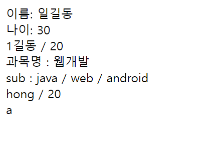 1 2 3 4 5 6 7 8 9 10 11 12 13 14 15 16 17 18 19 20 21 22 23 24 25 26 27 28 29 30 31 | <%@ page language="java" contentType="text/html; charset=UTF-8" pageEncoding="UTF-8"%> <!DOCTYPE html> <html> <head> <meta charset="UTF-8"> <title>Insert title here</title> <script> var p = {'name':'일길동', 'age' : '30', 'tel: ' : '010-2323-2323'}; /* 콜론을 기준으로 key값과 value값을 나눠서 가진다. */ document.write("이름: "+ p.name + "<br>나이: " + p.age +"<br>"); /* JSON 배열 */ var p_arr = [{'name':'1길동','age':'20'},{'name':'2길동', 'age':'30', 'tel':'010-0000-0000'}]; document.write(p_arr[0].name + " / " +p_arr[0].age +"<br>"); /* JSON 다차원 배열 */ var course = {'name' : '웹개발', 'start' : '2022-08-01', 'end' : '2023-01-01', 'sub' : ['java','web','android'], 'student' : [{'name':'hong','age':'20', 'hobby':['a','b']},{'name':'kim','age':'25'}] }; document.write("과목명 : " + course.name + "<br>"); document.write("sub : " + course.sub[0] + " / " + course.sub[1] + " / " + course.sub[2] + "<br>"); document.write(course.student[0].name + " / " + course.student[0].age + "<br>"); document.write(course.student[0].hobby[0]); </script> </head> <body> <!-- JSON(JavaScript Object Notation) : 서로 다른 플랫폼에서 데이터를 쉽게 교환하기 위한 표기법 --> </body> </html> | cs |