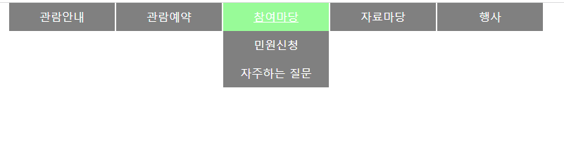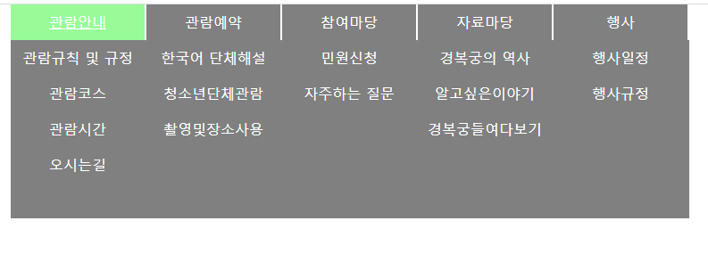1 2 3 4 5 6 7 8 9 10 11 12 13 14 15 16 17 18 19 20 21 22 23 24 25 26 27 28 29 30 31 32 33 34 35 36 37 38 39 40 41 42 43 44 45 46 47 48 49 50 51 52 53 54 55 56 57 58 59 60 61 62 63 64 65 66 67 68 69 70 71 72 73 74 75 76 77 78 79 80 81 82 83 84 85 86 87 88 89 90 91 92 93 | <!DOCTYPE html> <html lang="ko"> <head> <meta charset="UTF-8"> <meta http-equiv="X-UA-Compatible" content="IE=edge"> <meta name="viewport" content="width=device-width, initial-scale=1.0"> <title>horizontal-menu</title> <link rel="stylesheet" href="../style/reset.css"> <style> * { margin: 0; padding: 0; box-sizing: border-box; } a, a:active, a:visited { text-decoration: none; color: inherit; } a:hover { color: inherit; text-decoration: underline; } li { list-style-type: none; } header{ position: relative; } .lnb>ul {display: flex; justify-content: center; text-align: center; } .lnb li { margin-right:2px; } .lnb a {display: block; width: 150px; height: 40px; text-align: center; line-height: 40px; background-color: gray; color: white; } .subMenu { height:200px; display: none; position: absolute; background-color: gray; } .lnb>ul:hover .subMenu {display: block;} .lnb>ul>li:hover>a{ background-color: palegreen;} .subMenu a:hover { background-color: palegreen;} </style> </head> <body> <header> <div class="lnb"> <ul> <li><a href="#">관람안내</a> <ul class="subMenu"> <li><a href="#">관람규칙 및 규정</a></li> <li><a href="#">관람코스</a></li> <li><a href="#">관람시간</a></li> <li><a href="#">오시는길</a></li> </ul> </li> <li><a href="#">관람예약</a> <ul class="subMenu"> <li><a href="#">한국어 단체해설</a></li> <li><a href="#">청소년단체관람</a></li> <li><a href="#">촬영및장소사용</a></li> </ul> </li> <li><a href="#">참여마당</a> <ul class="subMenu"> <li><a href="#">민원신청</a></li> <li><a href="#">자주하는 질문</a></li> </ul> </li> <li><a href="#">자료마당</a> <ul class="subMenu"> <li><a href="#">경복궁의 역사</a></li> <li><a href="#">알고싶은이야기</a></li> <li><a href="#">경복궁들여다보기</a></li> </ul> </li> <li><a href="#">행사</a> <ul class="subMenu"> <li><a href="#">행사일정</a></li> <li><a href="#">행사규정</a></li> </ul> </li> </ul> </div> </header> </body> </html> | cs |