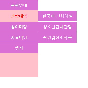 1 2 3 4 5 6 7 8 9 10 11 12 13 14 15 16 17 18 19 20 21 22 23 24 25 26 27 28 29 30 31 32 33 34 35 36 37 38 39 40 41 42 43 44 45 46 47 48 49 50 51 52 53 54 55 56 57 58 59 60 61 62 63 64 65 66 67 68 69 70 71 72 73 74 75 76 77 78 79 80 81 82 83 84 85 86 87 88 89 90 | <!DOCTYPE html> <html lang="ko"> <head> <meta charset="UTF-8"> <meta http-equiv="X-UA-Compatible" content="IE=edge"> <meta name="viewport" content="width=device-width, initial-scale=1.0"> <title>verticalmenu-2d</title> <link rel="stylesheet" href="../style/reset.css"> <style> * { margin: 0; padding: 0; box-sizing: border-box; } a, a:active, a:visited { text-decoration: none; color: inherit; } a:hover { color: inherit; text-decoration: underline; } li { list-style-type: none; } .lnb { width: 150px; height: 300px; background-color: pink; } .lnb>ul>li>a{ color: white; font-weight: bold;} .lnb>ul>li:hover>a {color: red; background-color: pink;} /* 1depth와 2depth에 hover시 차이 */ .lnb a {display: block; width: 150px; height: 40px; text-align: center; line-height: 40px; background-color:orchid; color: white; margin-bottom:2px; } .lnb>ul>li {position: relative;} .subMenu {position: absolute; left: 150px; top:0; display: none;} .lnb>ul>li:hover> .subMenu {display: block;} .subMenu a:hover {color: red; background-color: pink; } </style> </head> <body> <header> <div class="lnb"> <ul> <li><a href="#">관람안내</a> <ul class="subMenu"> <li><a href="#">관람규칙 및 규정</a></li> <li><a href="#">관람코스</a></li> <li><a href="#">관람시간</a></li> <li><a href="#">오시는길</a></li> </ul> </li> <li><a href="#">관람예약</a> <ul class="subMenu"> <li><a href="#">한국어 단체해설</a></li> <li><a href="#">청소년단체관람</a></li> <li><a href="#">촬영및장소사용</a></li> </ul> </li> <li><a href="#">참여마당</a> <ul class="subMenu"> <li><a href="#">민원신청</a></li> <li><a href="#">자주하는 질문</a></li> </ul> </li> <li><a href="#">자료마당</a> <ul class="subMenu"> <li><a href="#">경복궁의 역사</a></li> <li><a href="#">알고싶은 이야기</a></li> <li><a href="#">경복궁들여다보기</a></li> </ul> </li> <li><a href="#">행사</a> <ul class="subMenu"> <li><a href="#">행사일정</a></li> <li><a href="#">행사규정</a></li> </ul> </li> </ul> </div> </header> </body> </html> | cs |