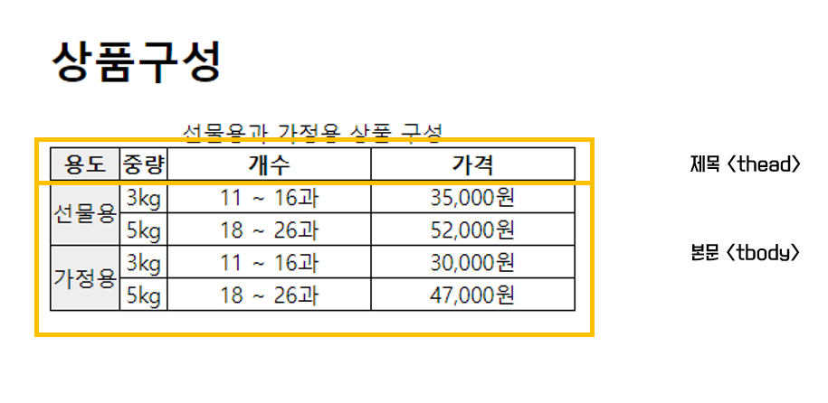 <caption>선물용과 가정용 상품 구성</caption>