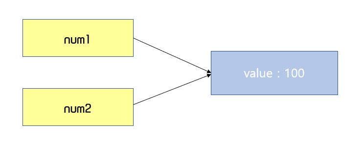 즉, 변수 num1, num2 모두 동일한 객체를 참조하고 있다.