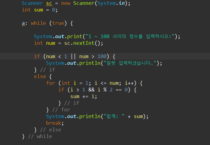 첫 번째 조건문에서 num이 1보다 작고 100보다 크다면 "잘못 입력하셨습니다."를 출력하고 다시 입력을 받는다.