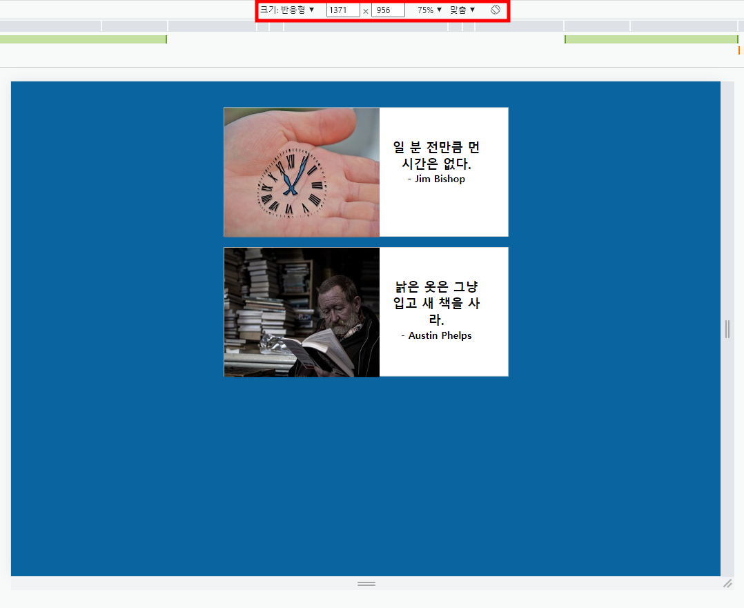 width가 1440px 미만으로 줄이자 나열되어 있던 카드가 한 줄에 하나씩 두 줄로 표시된다.