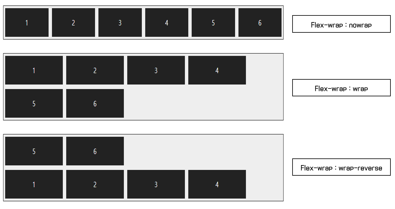 | wrap-reverse | 플렉스 항목을 여러 줄에 표시하되, 시작점과 끝점이 바뀐다. |