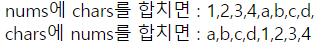 document.write(`nums에 chars를 합치면 : ${numChars}, <br> chars에 nums를 합치면 : ${charNums} <br>`);